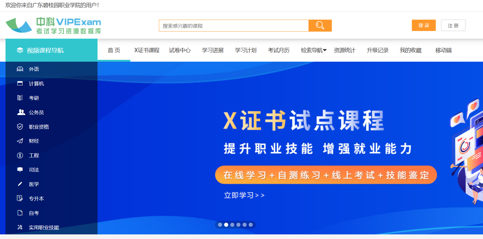 VIPExam考试库以精品视频课程为核心资源,以切实提升大学生职业技能、提高就业竞争力为核心目标,是集在线学习、模拟自测、复习备考、职业技能鉴定于一体的新一代职业教育数据库。